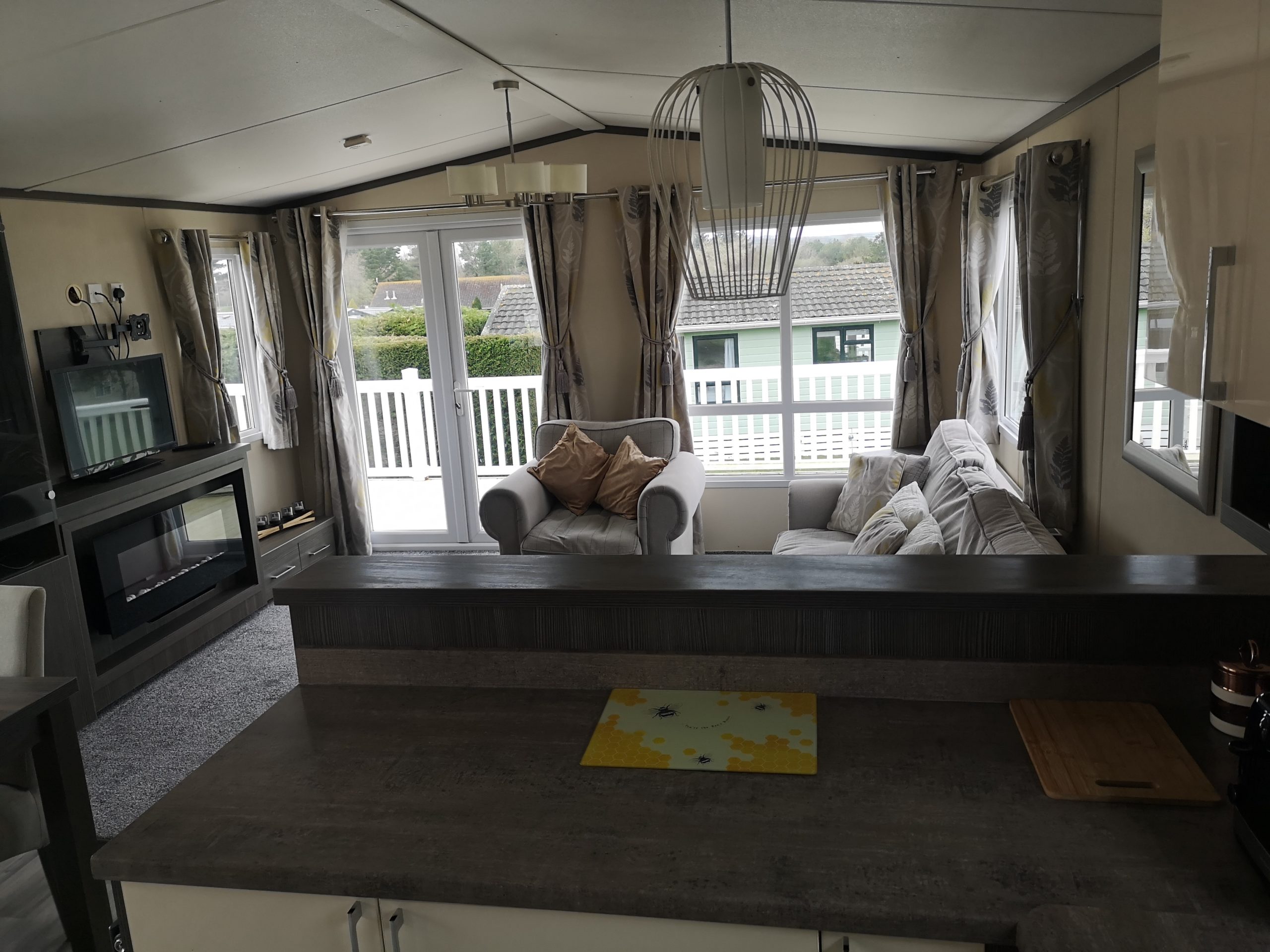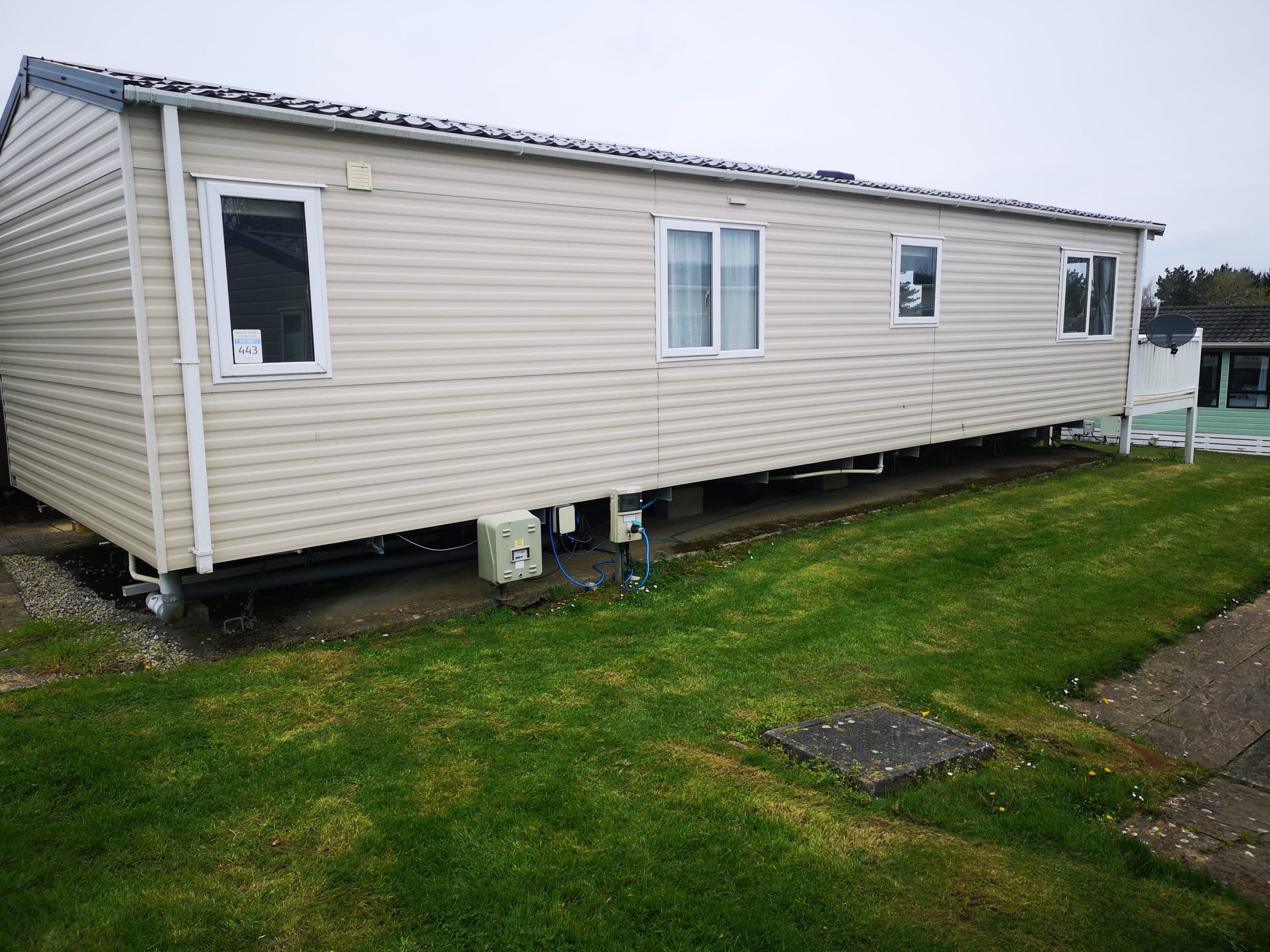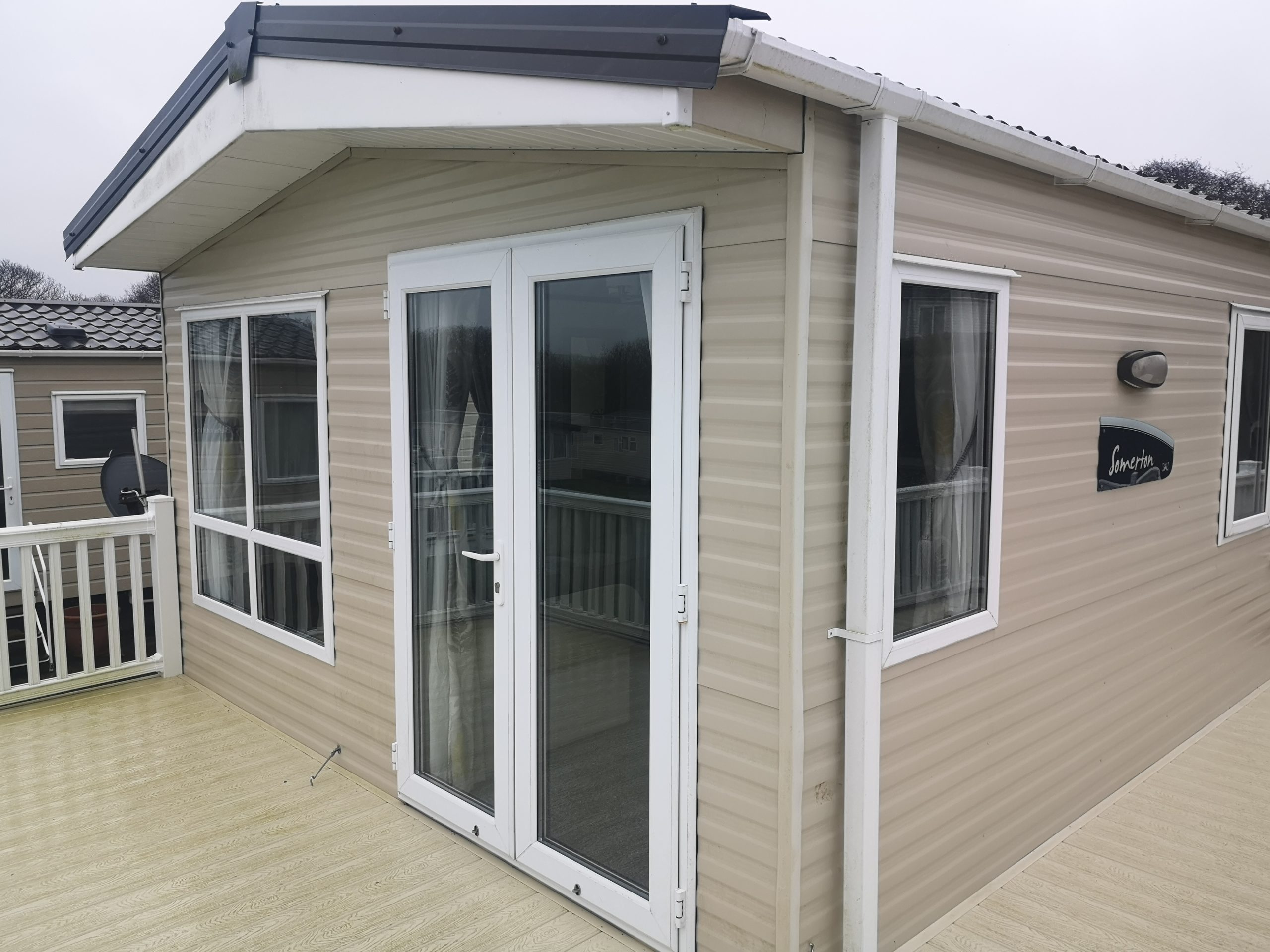 The 443 Somerton is a new caravan situated in the Oaks Forest area of the park and is a luxurious 2 bed 6 berth caravan. It has French doors that roll onto a gated side deck and has a table & chairs. Double glazing, full central heating and en-suit toilet with shower to the master bedroom with a King Size double bed and TV on the wall. In the lounge is a TV/DVD and a full kitchen inventory, with a full fridge freezer, iron and ironing board etc etc………