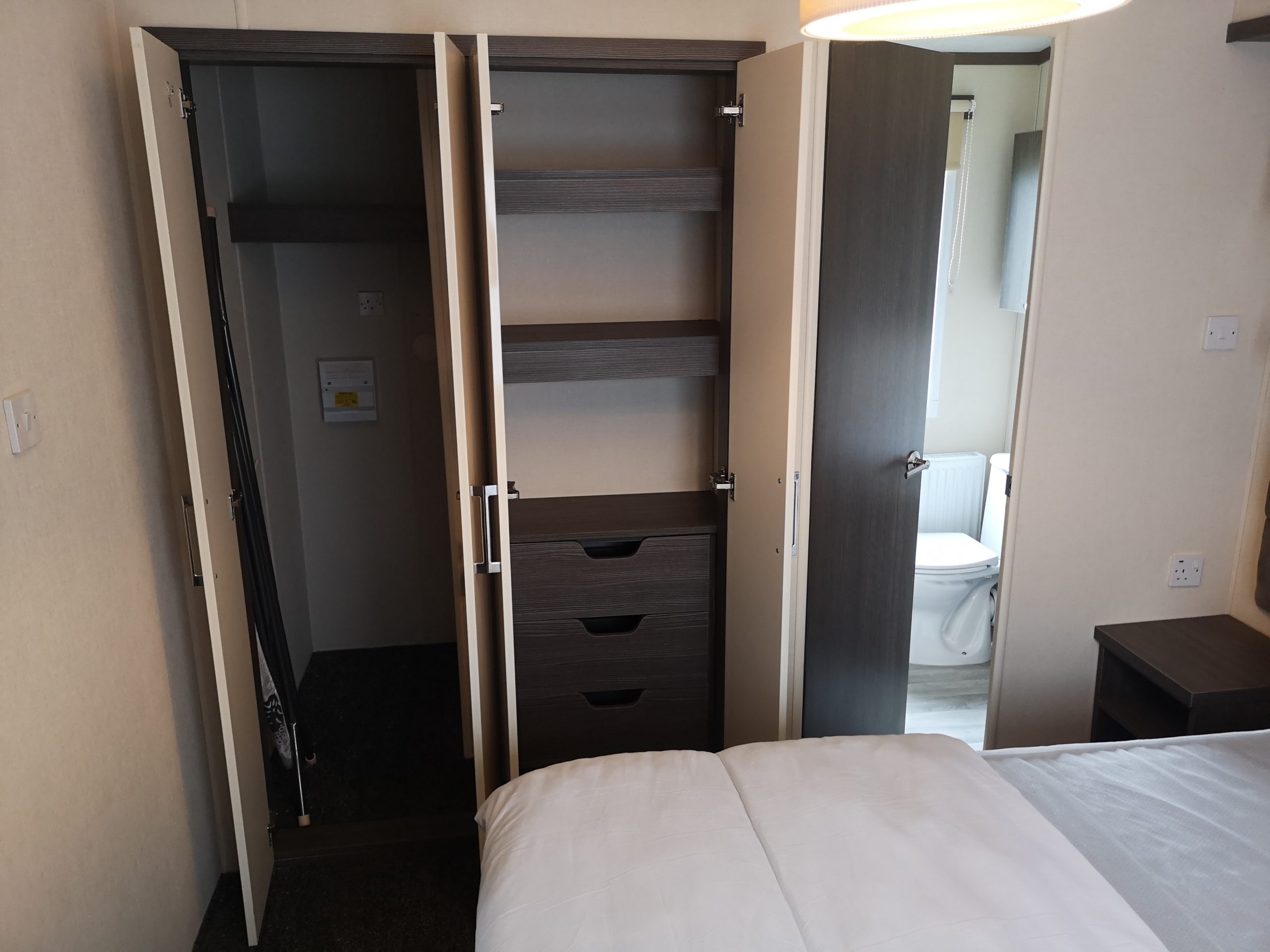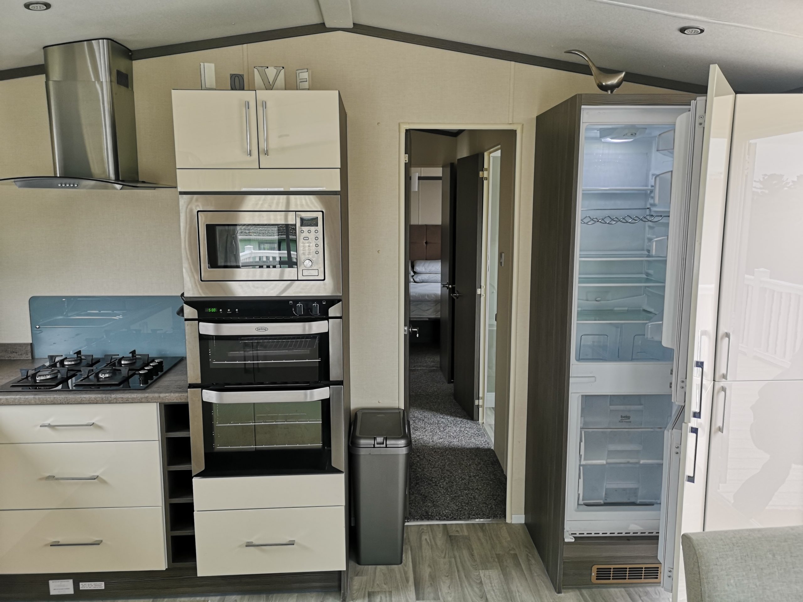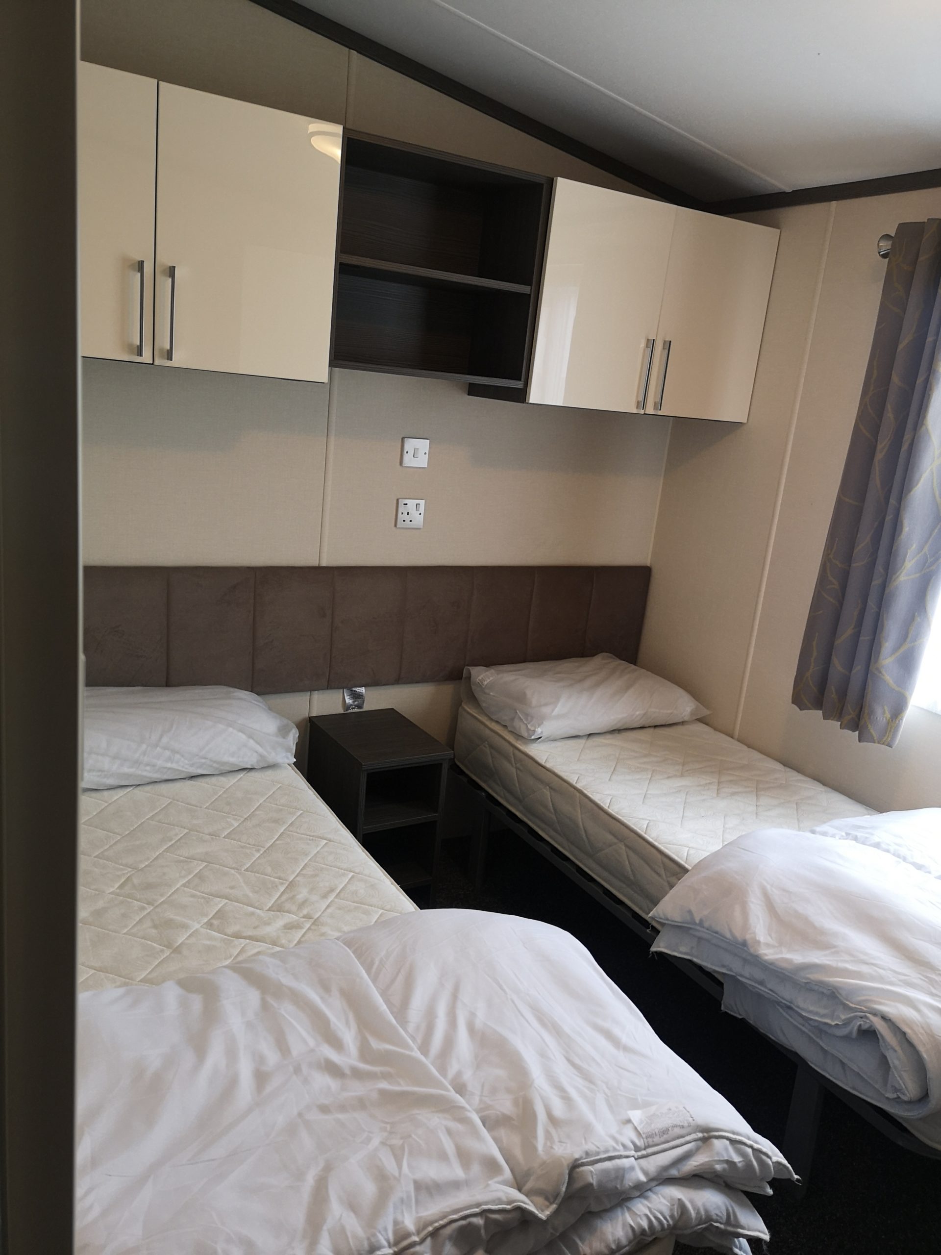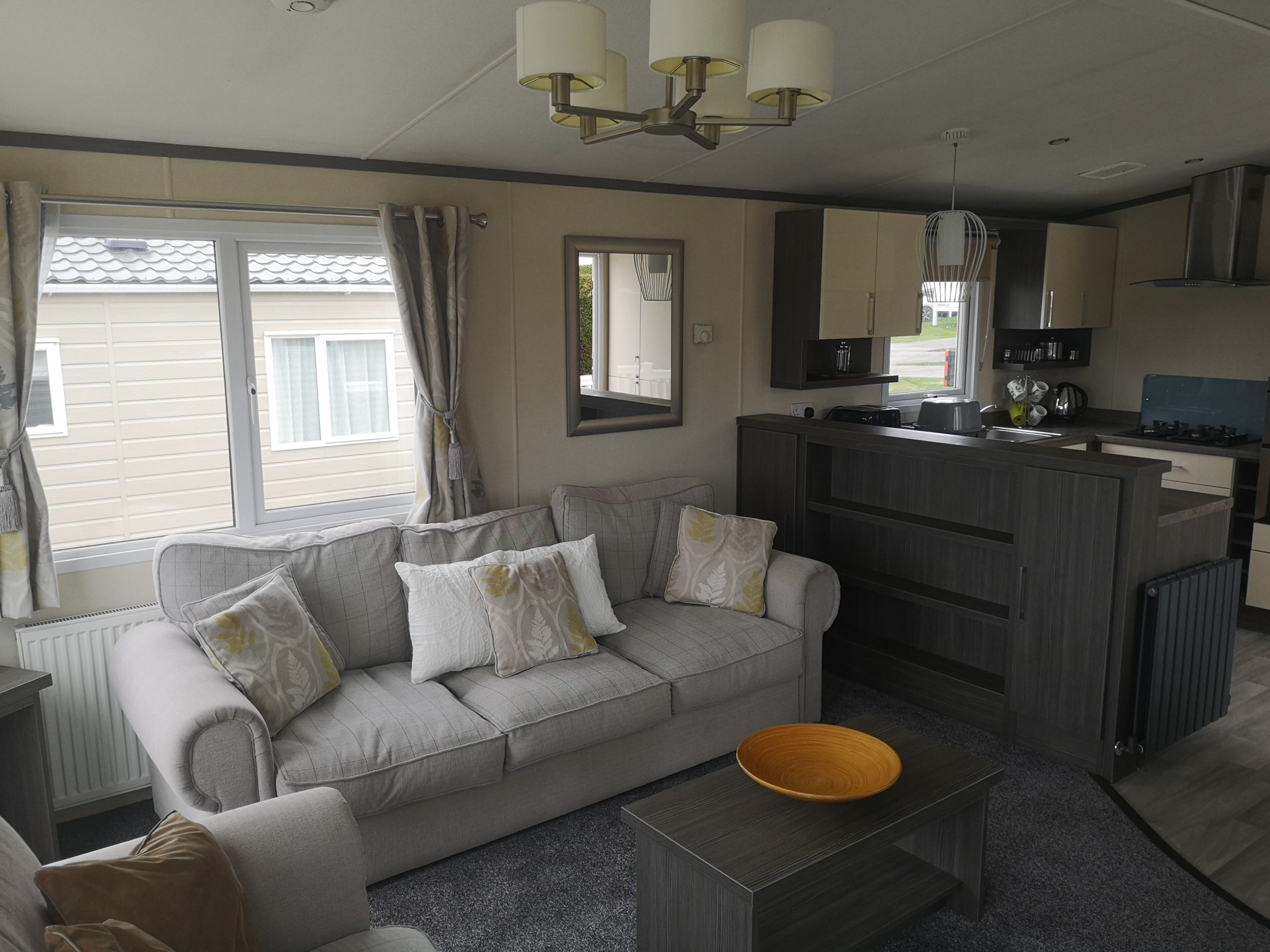 The 443 Somerton is a new caravan situated in the Oaks Forest area of the park and is a luxurious 2 bed 6 berth caravan. It has French doors that roll onto a gated side deck and has a table & chairs. Double glazing, full central heating and en-suit toilet with shower to the master bedroom with a King Size double bed and TV on the wall. In the lounge is a TV/DVD and a full kitchen inventory, with a full fridge freezer, iron and ironing board etc etc………