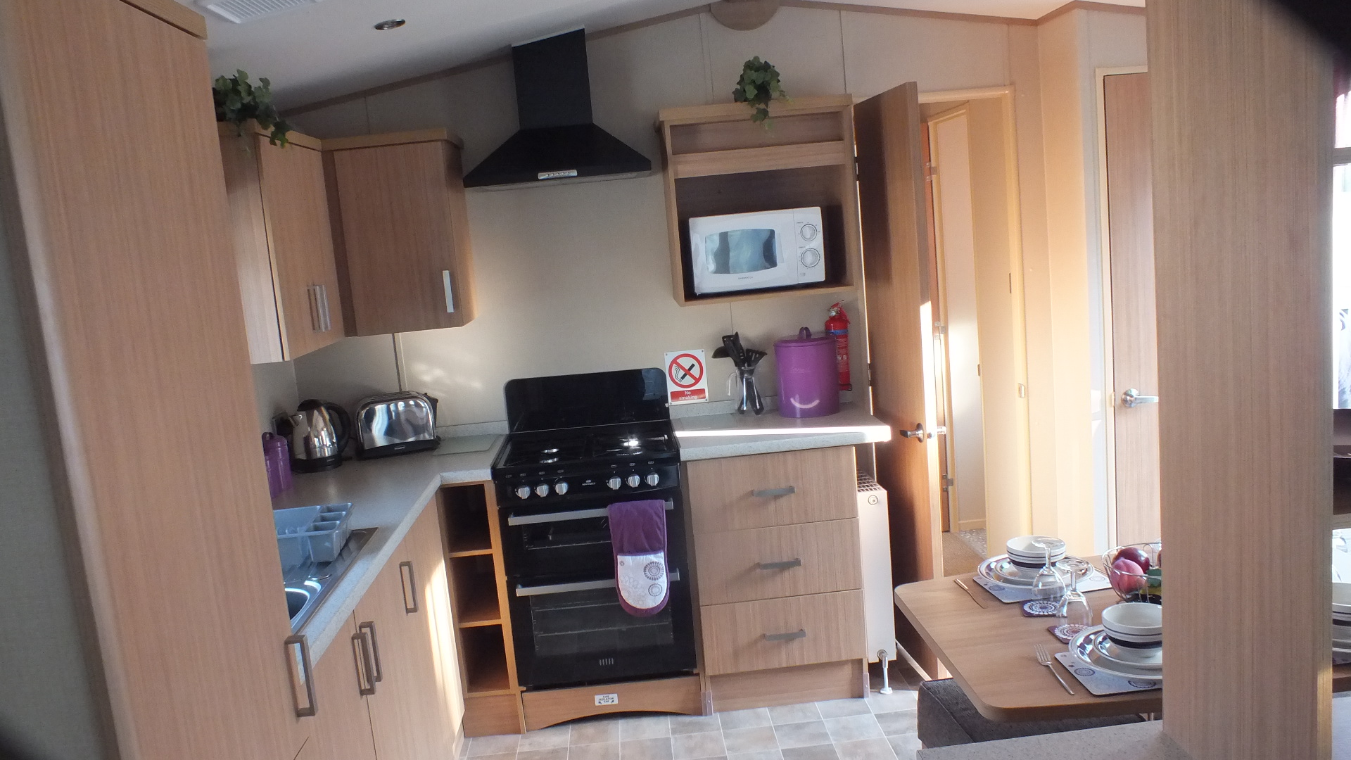 Our 601 Windermere caravan is a 3 bed 8 berth 38ft long x 12ft wide caravan with a very large 16ft x 12ft front decking, with an enclosed decking down the side, with a lockable gate and 3 steps.