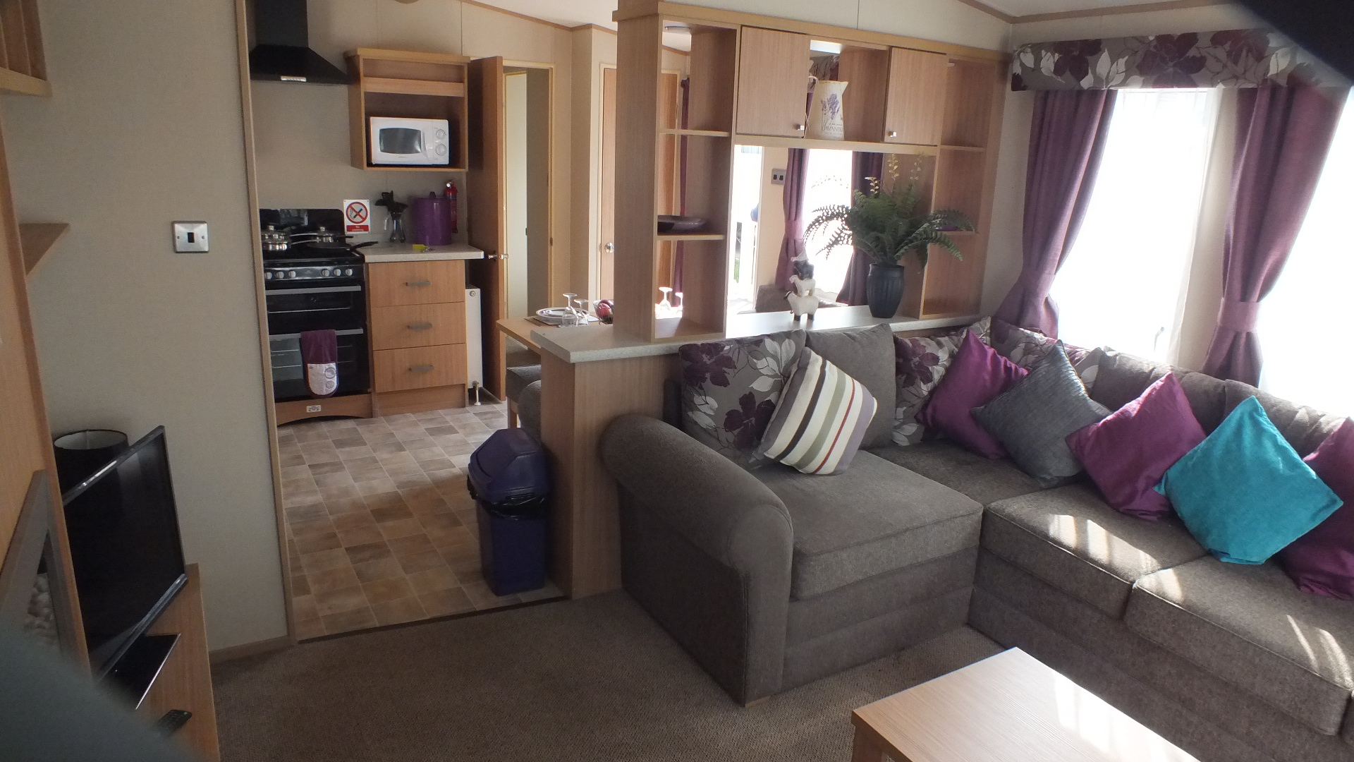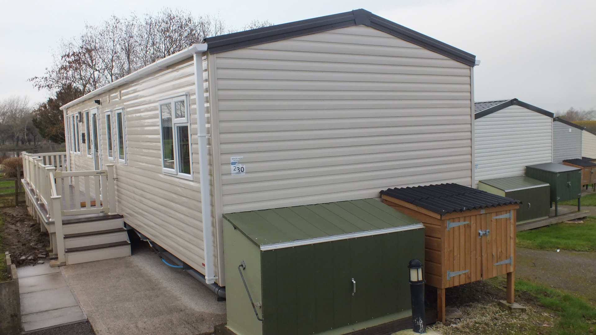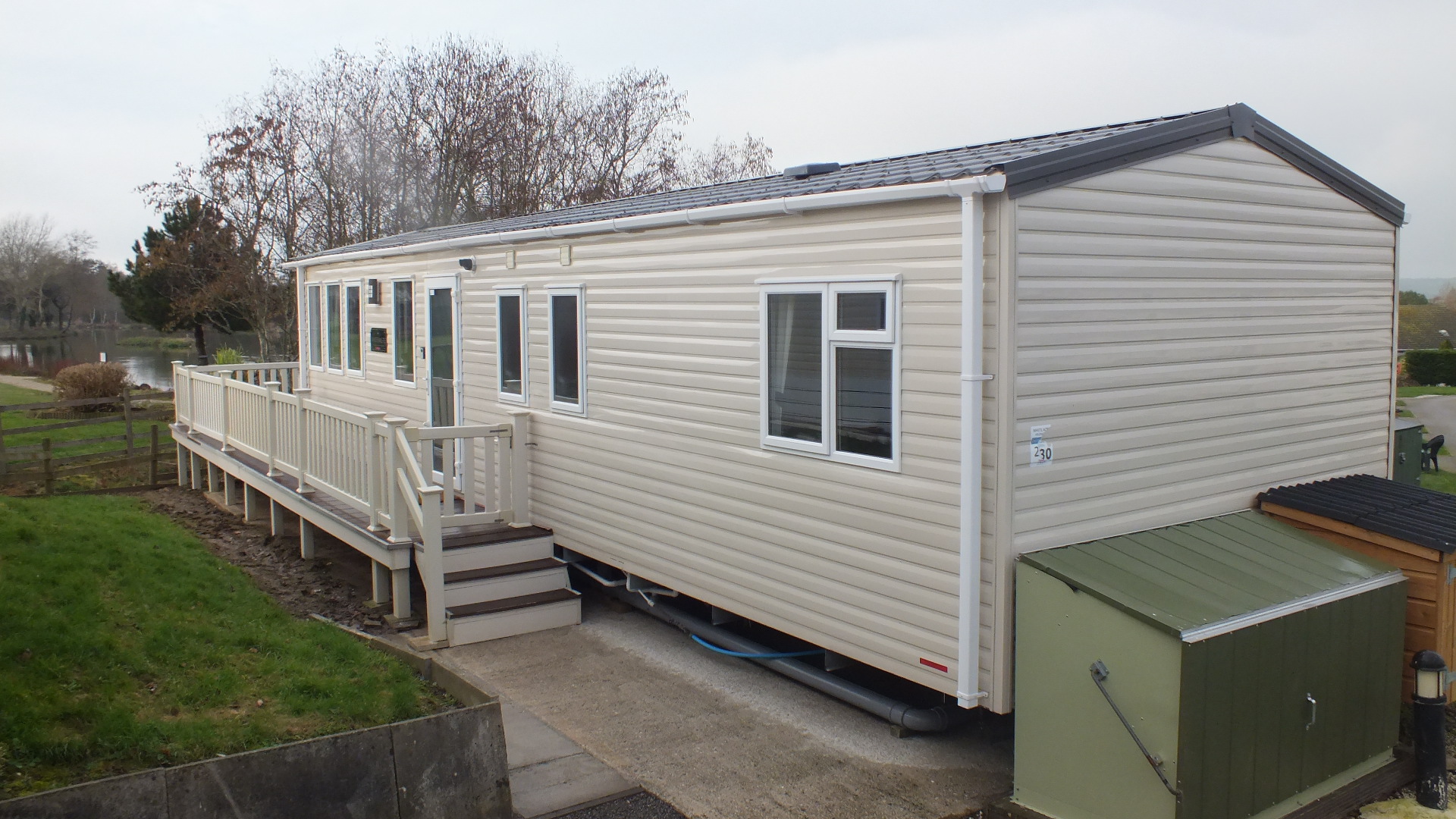 Our 601 Windermere caravan is a 3 bed 8 berth which is 38ft long x 12ft wide caravan with a very large 16ft x 12ft front decking, with an enclosed decking down the side, with a lockable gate and 3 steps.